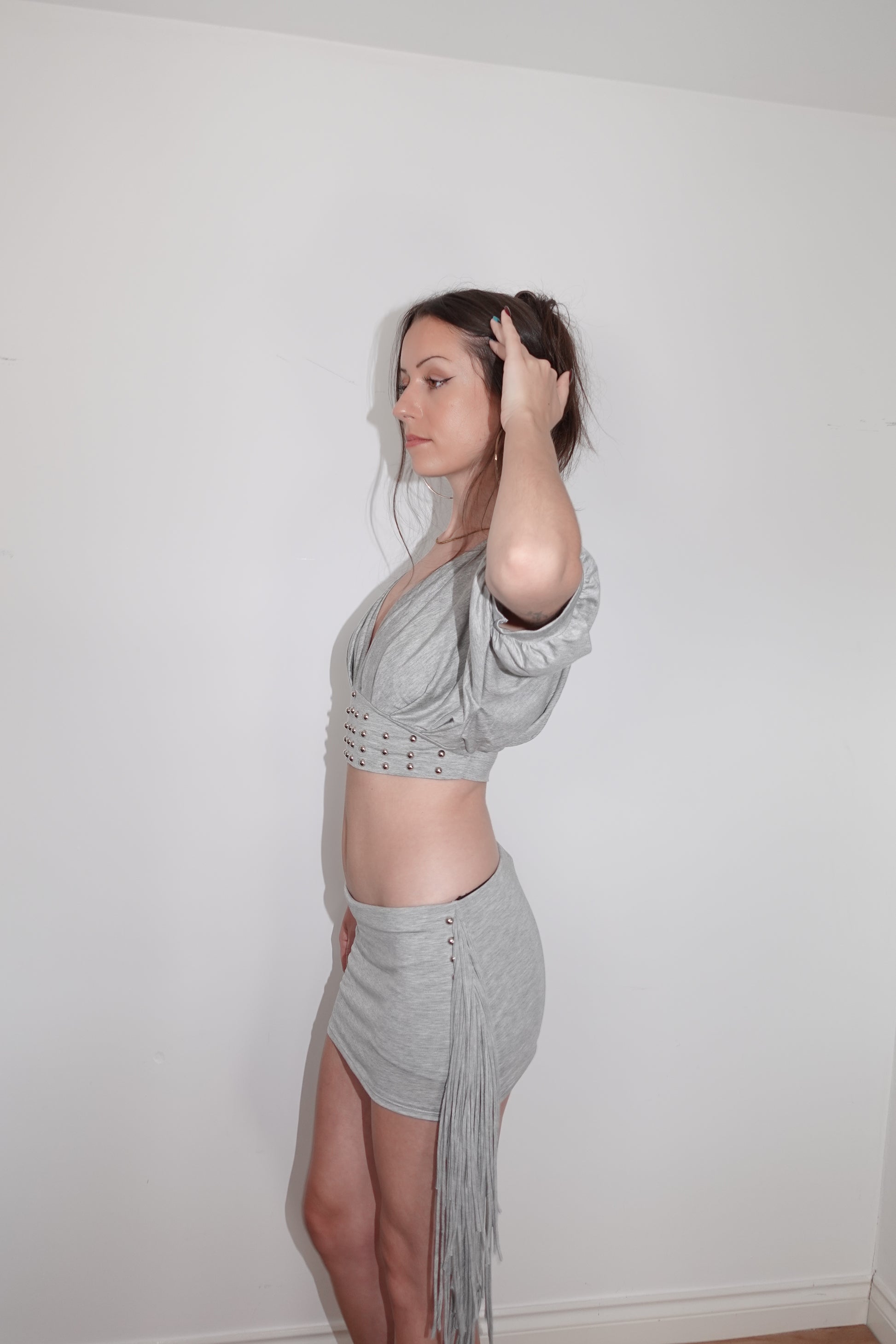 The deep V-neckline adds a touch of sultry sophistication, while the voluminous puff sleeves . This fashion-forward top blends modern minimalism with vintage-inspired flair. The structured puffed sleeves create a bold silhouette while the cropped fit flatters your waistline.